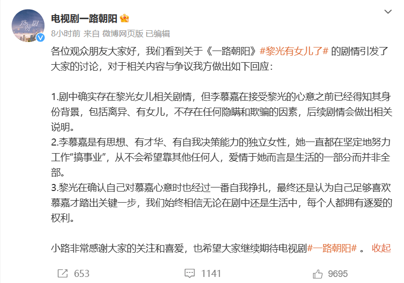 搜狐娱乐讯 近日,电视剧《一路朝阳》中,男主黎光有女儿了相关剧情引发争议,对此电视剧《一路朝阳》官方回应表示:“剧中确实存在黎光女儿相关剧情,但李慕嘉在接受黎光的心意之前已经得知其身份背景,包括离异、有女儿,不存在任何隐瞒和欺骗的因素,后续剧情会做出相关说明。”