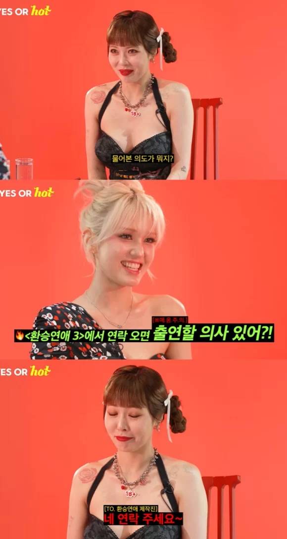 节目中,全昭弥问道:“如果《爱情转移3》联系你,你愿意出现吗?” ,泫雅似乎吃了一惊,但立刻回答“是”。