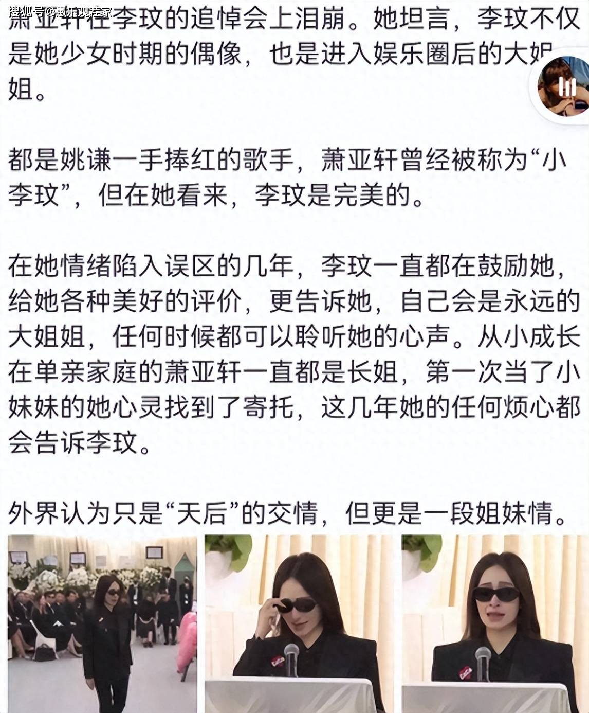 在李玟葬礼当天,萧亚轩作为致辞人上台讲话,身穿黑色西装的她几乎哭成了泪人,可想而知李玟的离世对她的打击有多大。