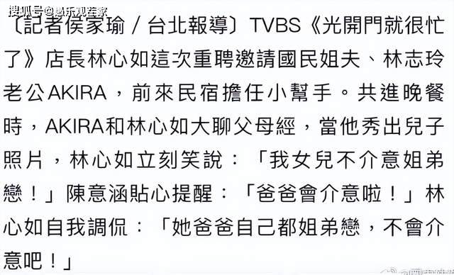 当林心如表示要把女儿嫁给林志玲儿子时,陈意涵还提醒她:“人家不喜欢姐弟恋。”林心如则笑称:“他爸爸自己就是姐弟恋,应该不会介意!”看的出来,她对林志玲的儿子确实很满意,是个妥妥的颜控。
