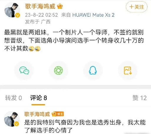 8月22日,海明威发文吐槽:最黑的就是两姐妹,一个制片人一个导师,不签约就别想晋级。