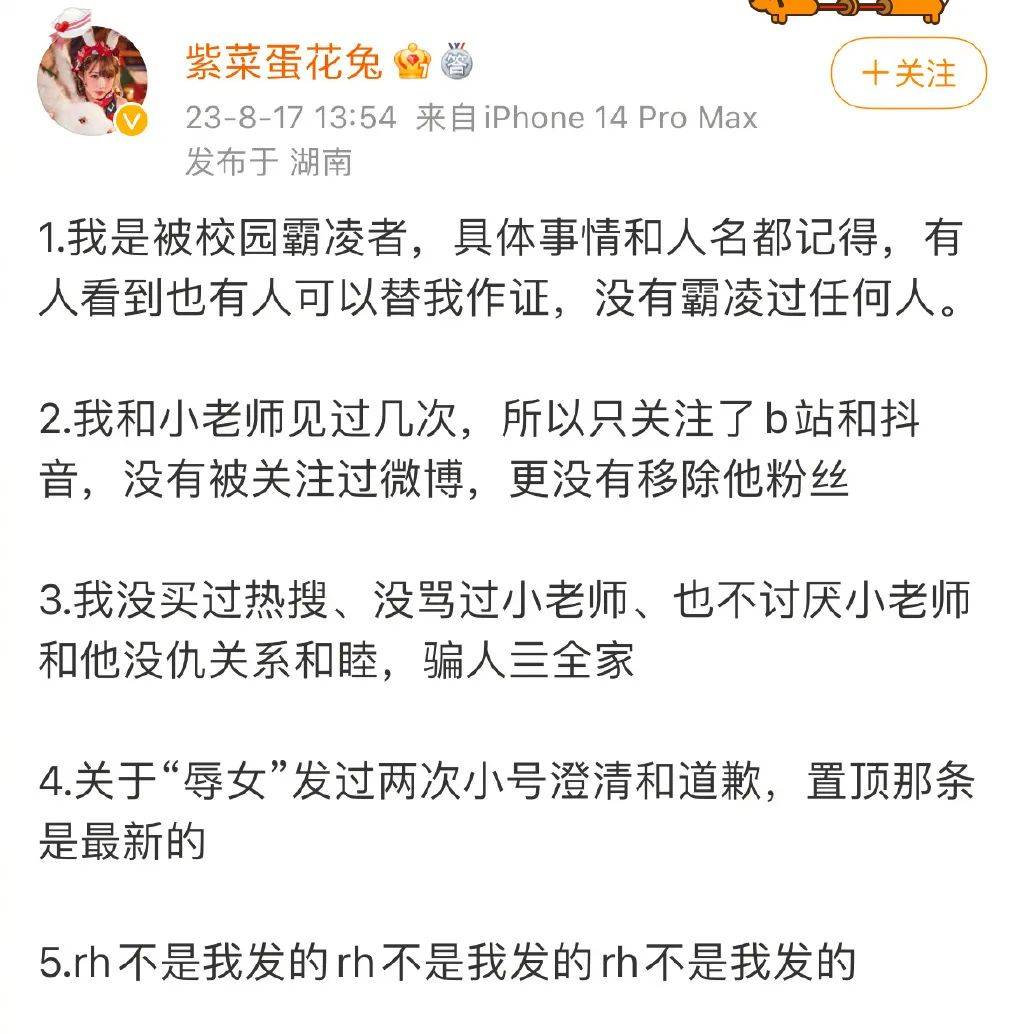 之后又有传言说法老打了小精灵,并且女方社交账号取关小精灵等等,法老和紫菜蛋花汤都发了微博澄清这些谣言。