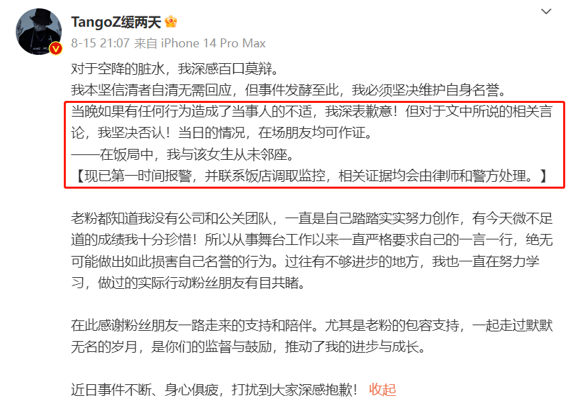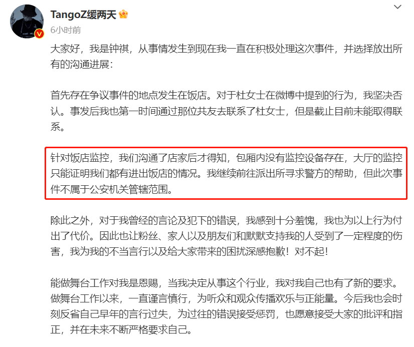 还说当晚他和杜紫怡从未邻座,以及,他已经第一时间联系饭店调监控、报警了,认为清者自清。