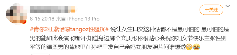 因为有这么多下头行为和发言,即使现在并没有锤能直接证明TangoZ那天对杜紫怡进行了言语性骚扰,但很多网友吃瓜吃到这里的时候基本已经默认了他做过,很难再洗白。