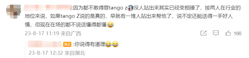 当然了,能让吃瓜网友们的立场这么快就从中立到一边倒,TangoZ那些圈内朋友可没少“出力”。