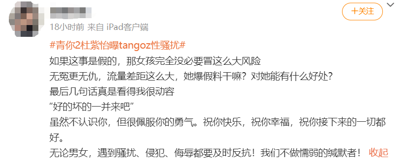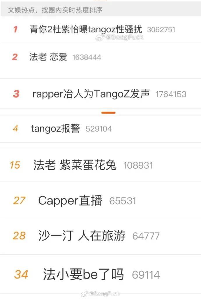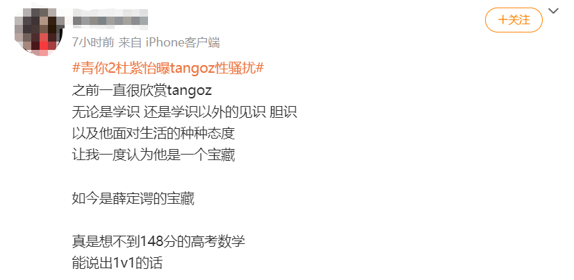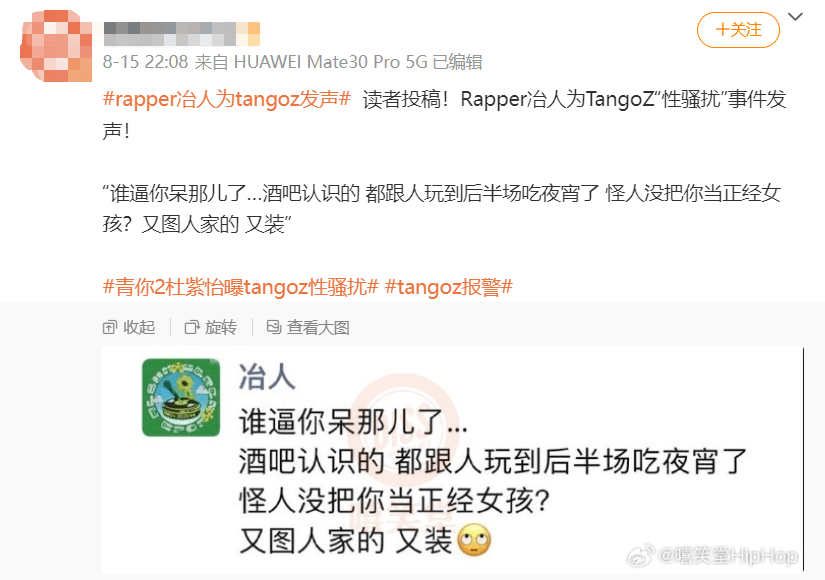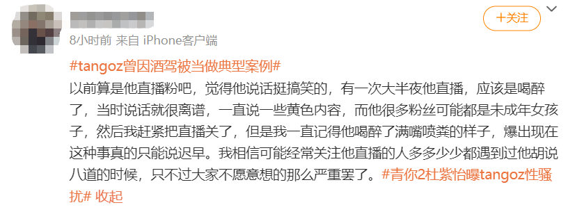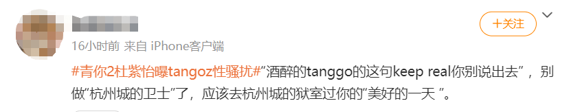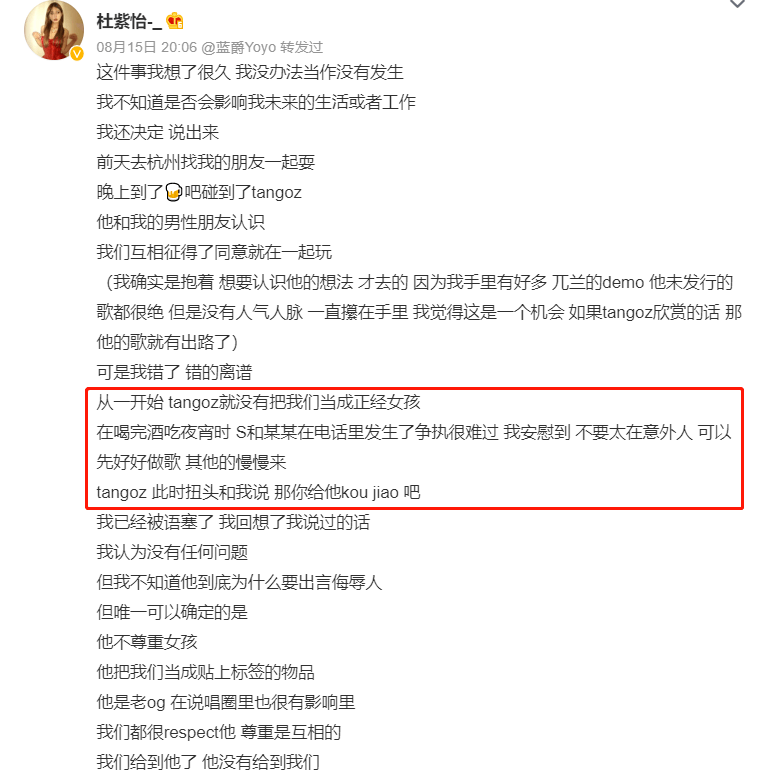 8月15号晚上有个参加过《青你》的女爱豆杜紫怡实名制举报了TangoZ,说自己在某次好友引荐的酒吧局里被TangoZ言语性骚扰。