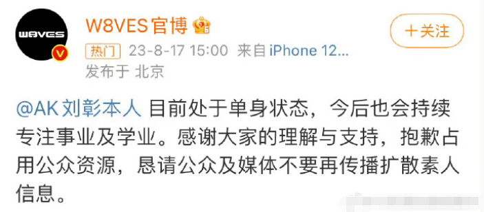 不过刘璋本人和所在厂牌最新的回应是:目前已经单身,以后会专注事业和学业,感谢大家理解。