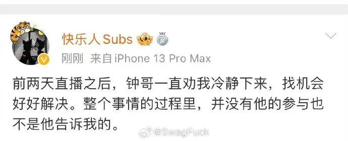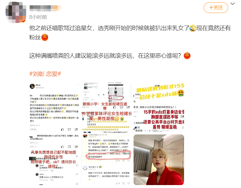 对于不care谈不谈恋爱的吃瓜路人来说,刘璋这回的翻车点则是在于他曾经(大概15岁的时候)也有过在社交媒体上辱女的黑历史,还唱歌diss过追星女孩(啊这…