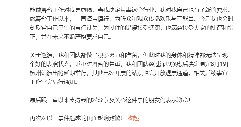 不过他依然简称自己没做过杜紫怡指控他的那些不尊重女性的事,但是宣布原定这周末举办的杭州站巡演延期,后续演出也开启了退票渠道,表示深感抱歉也尊重大家的意愿。