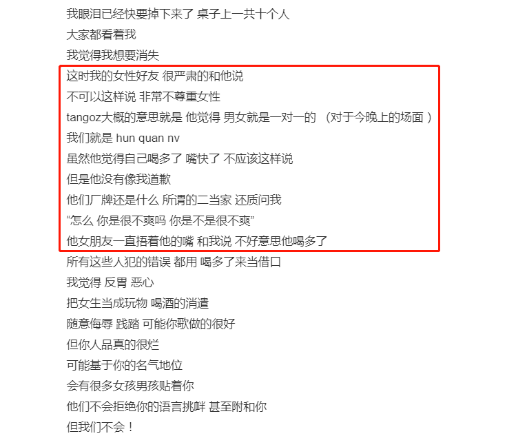 TangoZ当众说了这种垃圾话之后,同桌的十来个人里只有杜紫怡的一个女性好友严肃地反驳了回去,但TangoZ还是没觉得有什么不对,还表示那晚上男女就是一对一的,她们都是混圈女。言外之意就是觉得她们都坐在这了还装什么清高。