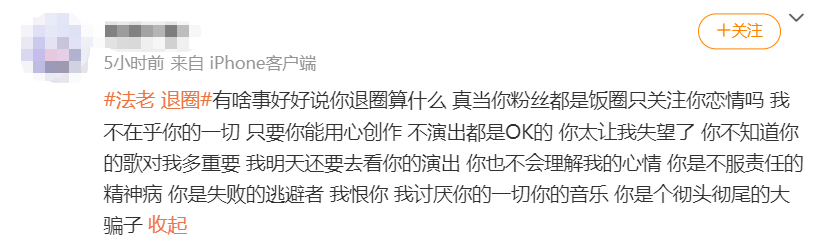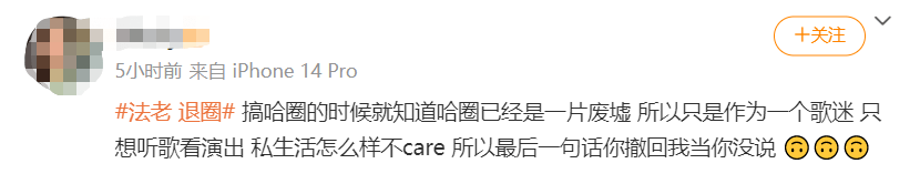 但是当然了,对于很多单纯喜欢法老的音乐的粉丝来说,最炸裂的不是他跟谁恋爱、他跟小精灵打没打架,最炸裂的是他居然要为爱退圈这件事,这种直接给人干退圈的嫂子真的是闻所未闻。