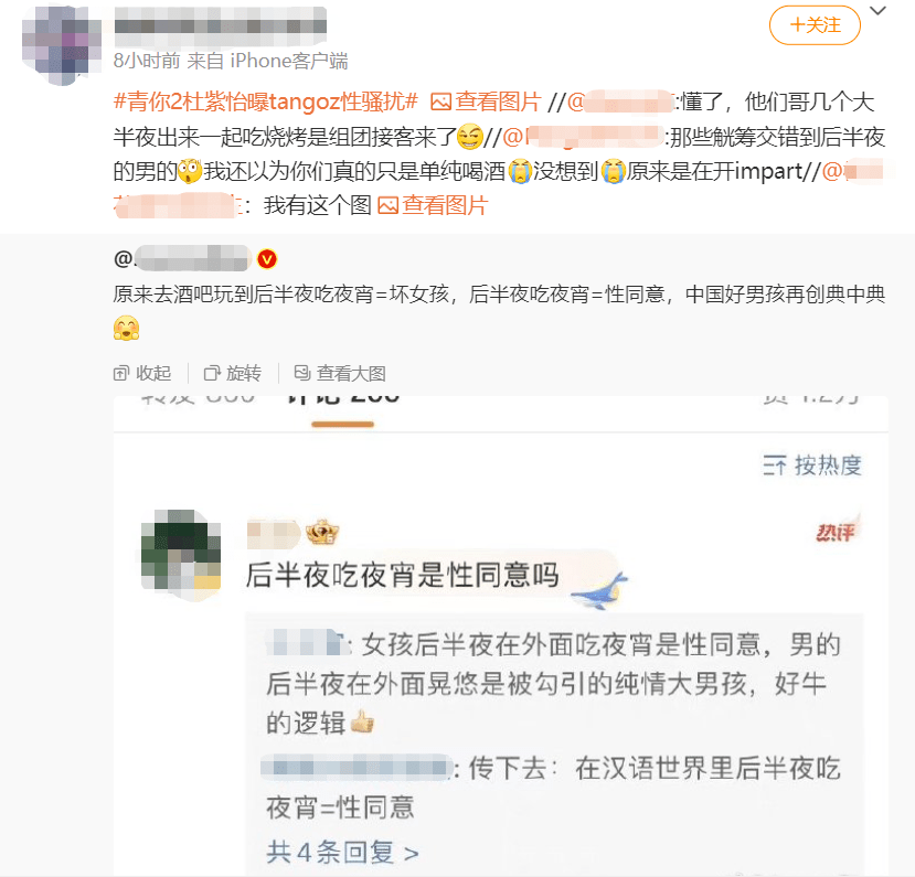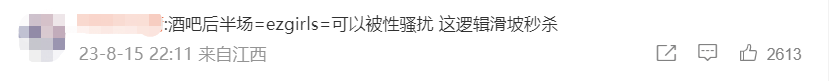 这话一出,很多网友的下头点瞬间就被戳中了,表示按他们这个逻辑,在酒吧玩到后半场吃个夜宵就=是他们口中的easy girl=性同意or可以被性骚扰,那整天在酒吧玩到后半夜的男人是什么,是在组团开impart吗?