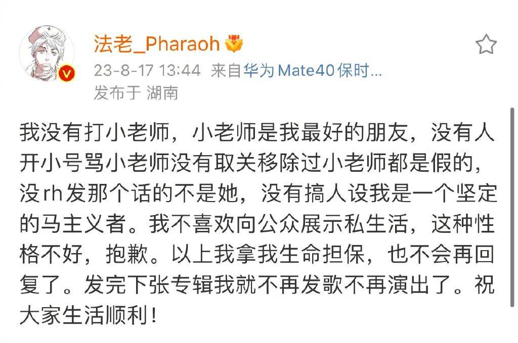 法老还表示他是个不喜欢向公众展示私生活的人,发完下张专辑之后他就不再发歌不再演出了,疑似预告退圈。