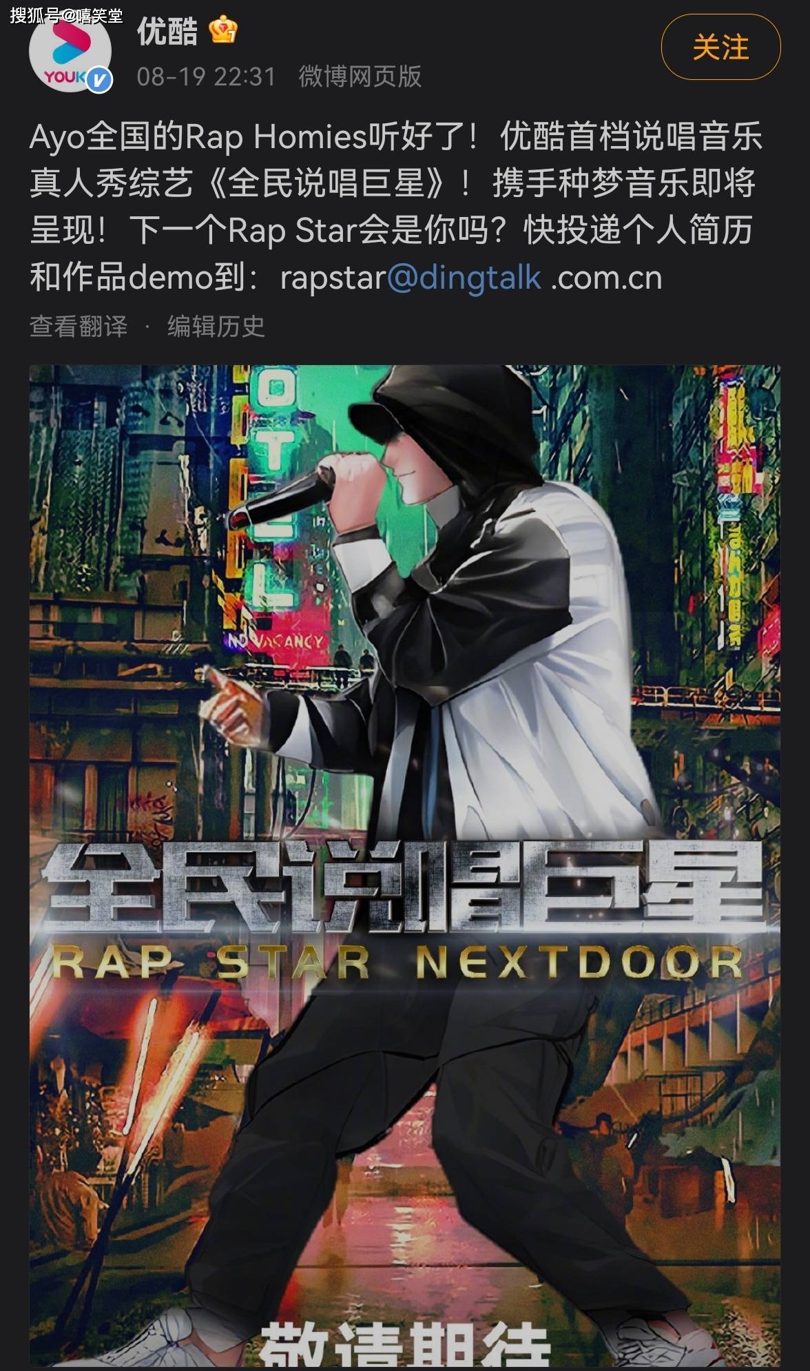 当然,除了《中国新说唱》和《全民说唱巨星》之外,严敏导演的《新说唱时代》也在两个月前开启了Rapper招募。