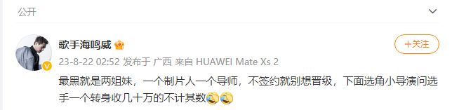 搜狐娱乐讯 8月22日,歌手海鸣威发文疑似吐槽《好声音》,称“最黑的就是两姐妹,一个制片人一个导师,不签约就别想晋级”。