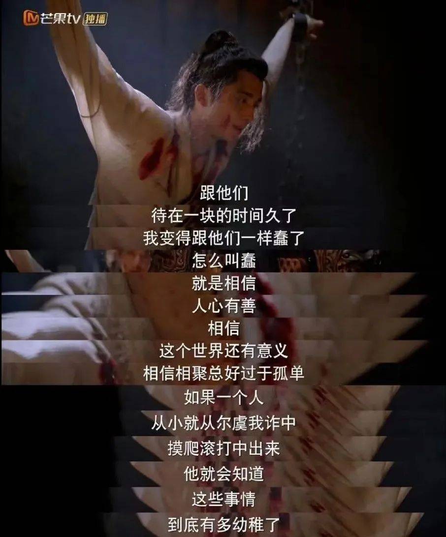 另一场则是男主角元仲辛(张新成饰)被曝光和西夏元昊一样有鲜卑血统,执行任务归来后被立刻下狱,感慨自己和七斋的人在一起久了变“蠢”了:“就是相信人心有善,相信这个世界还有意义,相信相聚总好过于孤单。”类似的台词,总能精确地戳到剧粉。