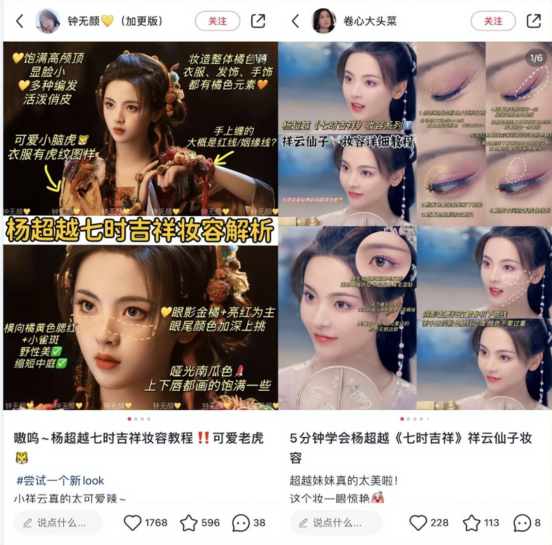 而在服化道的设计上,剧集以明快古雅的新国风美学为基调,借鉴苏绣、潮绣、缂丝、琉璃等传统工艺,造型风格端庄典雅,又活泼俏皮。同时,女主妆容还跟随服饰色调进行调整,根据不同服装、不同场景搭配不同的眼妆,#杨超越新剧10集换了8套眼妆#等话题就引起观众广泛讨论,还有不少妆容详解接连出圈,掀起了一波“东方幻想”美学热潮。
