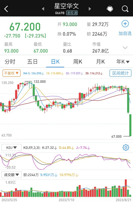 中国好声音制作方母公司星空华文一度跌超29% ,最低报67港元/股,总市值不足270亿元港元,与8月17日收盘价124港元/股相比,股价两日已接近腰斩。