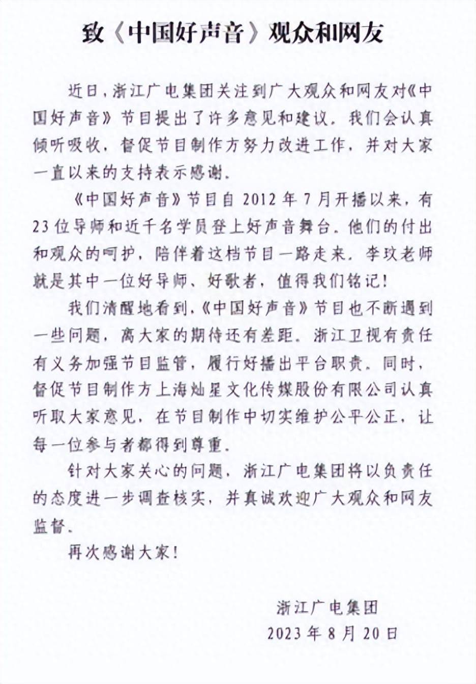 但纵观整篇声明,有感谢没有道歉,将网友的批评和谴责弱化成意见和建议,对于调查方式、时间节点没有说明和承诺,显然没有什么诚意,这意味着,网友的群情激奋没起到什么作用,风波到了浙江广电这里将画上句点。果不其然,有灿星内部人士向媒体透露,《中国好声音》将照常播出、照常录制。