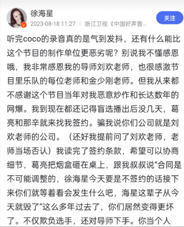 如今徐海星发文,除了公开支持李玟之外,还爆出节目中存在的一些潜规则,比如被逼着签合同等等,徐海星的一番言论,撕下了好声音节目组的遮羞布。