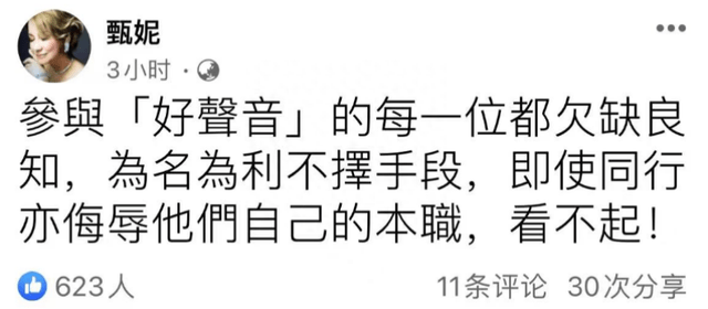甄妮表示参加好声音的众多音乐人,为了名利不择手段,做了有辱职业的事情,言下之意就是说明参加节目的众多音乐人,只有李玟敢于与节目的不文明事情做斗争,别的导师都默认了,甄妮的这番话会让很多参加过好声音的导师如坐针毡。