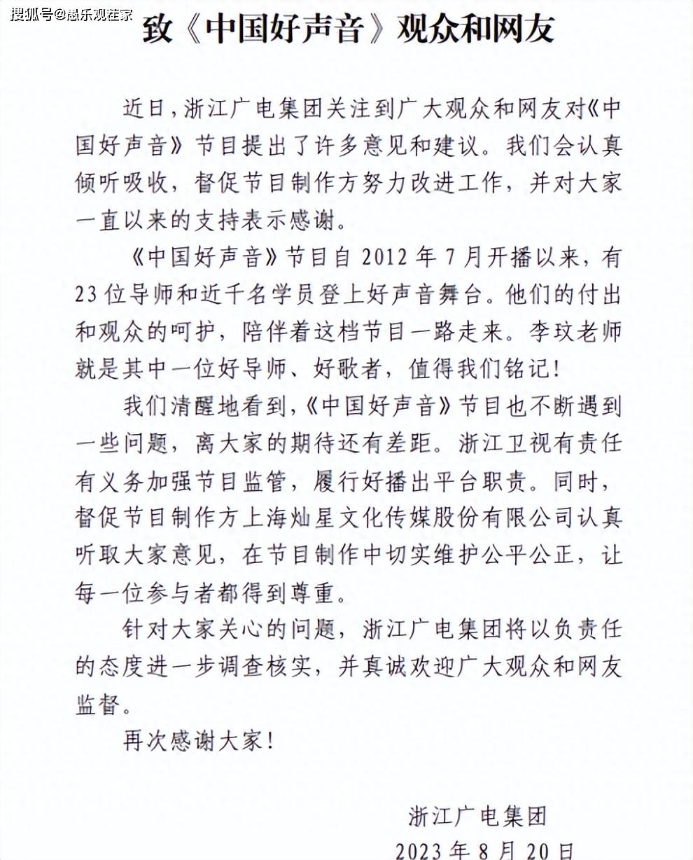 8月20日,浙江广电集团发布了一则声明,称已经注意到外界的舆论,后续将会对节目加强监督,履行应尽职责。事情从发生到现在已经好几天了,此前不管舆论怎么发酵,都没有影响到好声音,节目都是正常播出。如今道歉声明一出,好声音的股价就有了波动,希望他们真的可以引以为戒,好好整改。