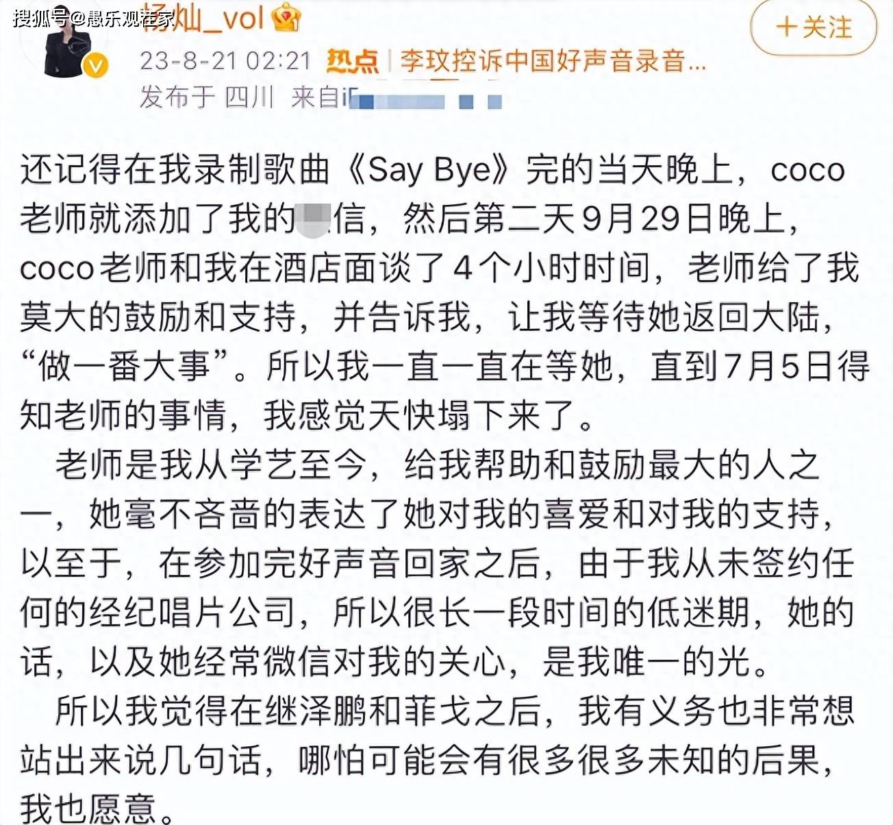 8月21日,《中国好声音》又有一位学员站出来爆料,引发网友热议。该成员名叫杨灿,也是李玟的学员之一。她于凌晨发表了一则千字长文,曝出好声音更多内幕。