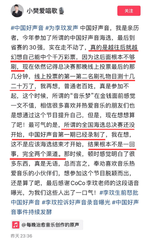原标题:今年参赛的好声音学员爆料:比赛结果已内定,冠军是花钱刷出来的