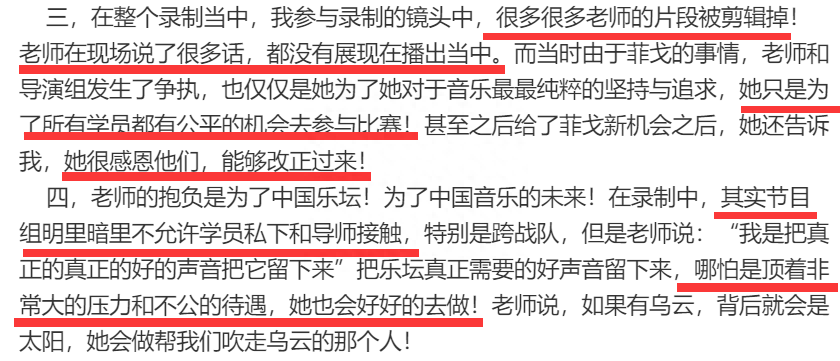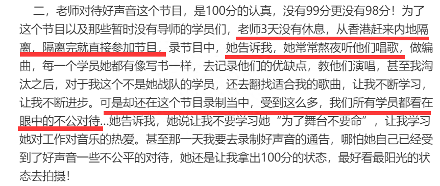 另外,李玟被节目组邀请后三天没有休息,特意从香港赶来,经常熬夜听学员唱歌,做编曲,对待每一个学员都尽心尽力,用心提携与点拨,所有的学员也看到了李玟受到的不公对待。