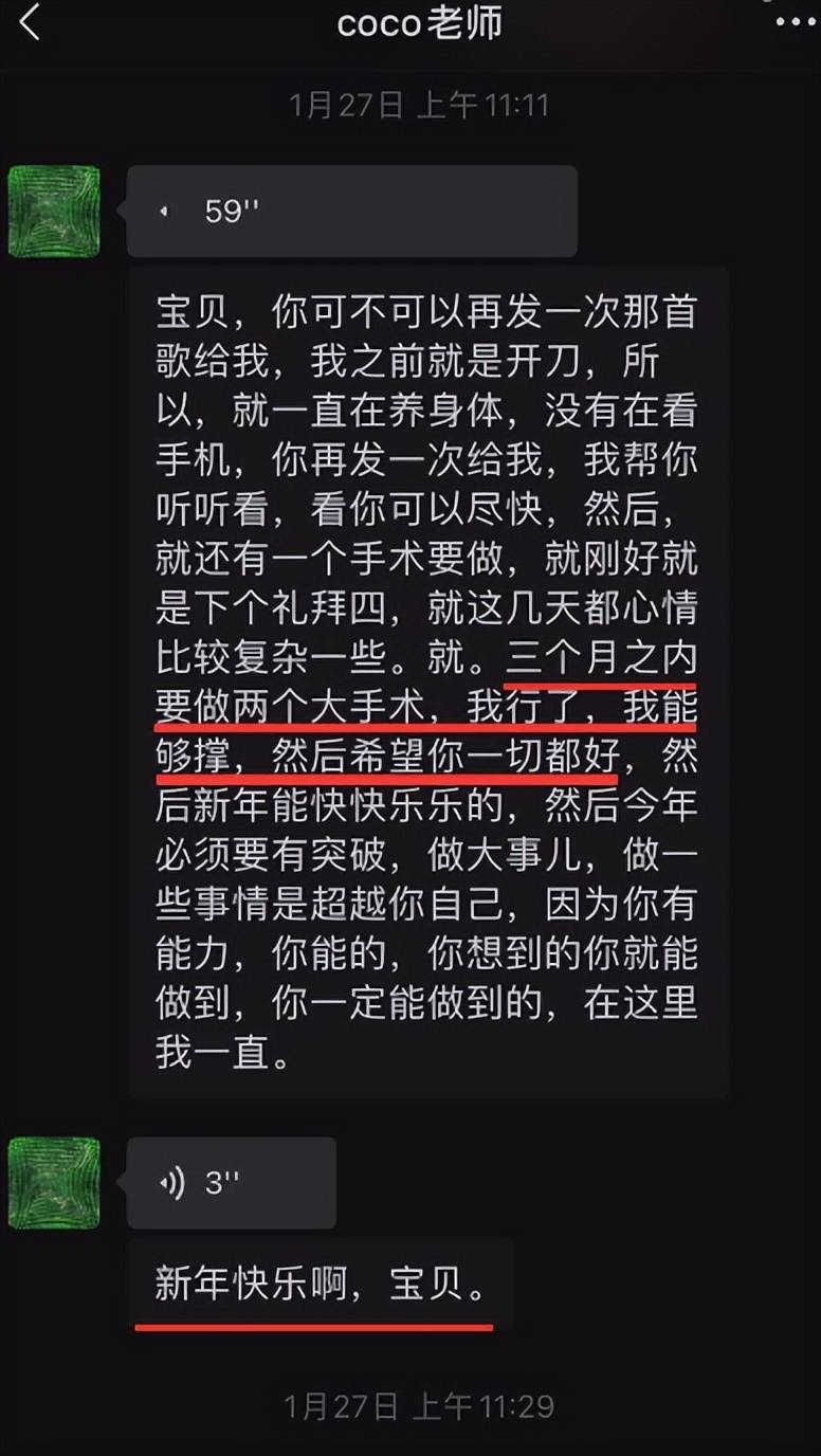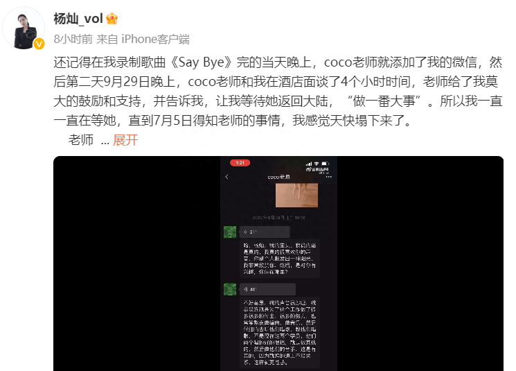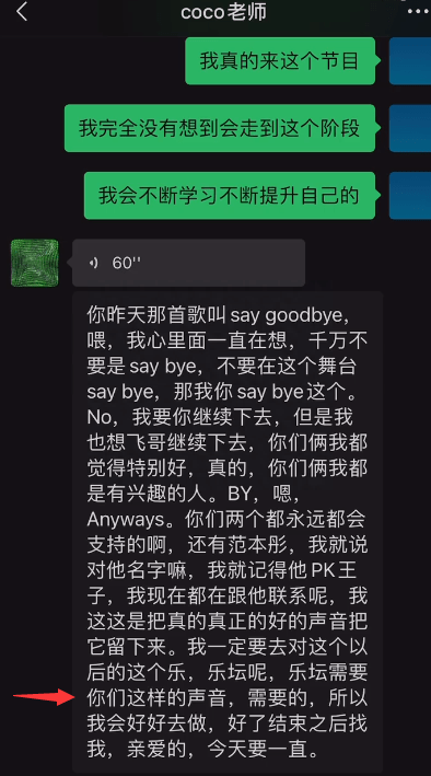 此外,杨灿还晒出了当时李玟发给他的微信内容,证实她所说的内容全部属实,聊天内容也可以看出李玟对她甚是赏识,在此期间,也给予他很多帮衬与鼓励,展现出专业导师应有的风采与素养。