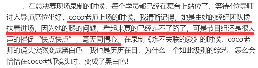 在小长文中,杨灿公开了节目组邀请李玟的内幕以及更多黑幕,她直言总决赛现场录制的时候,李玟上场的时候是由经纪团队搀扶着进场,因为她的腿有问题,看起来真的已经走不了路了,可是节目组还是大声催促“快点快点”,毫无同情心。