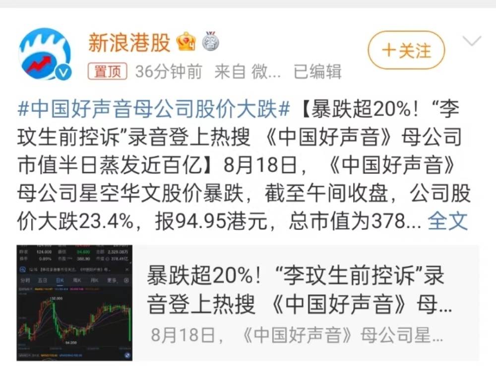 而在上周五(8月18日),好声音母公司的股价就已经暴跌超20%,市值便蒸发了近百亿。
