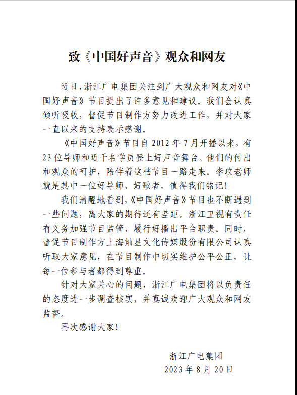 8月20日,针对这场声势浩大的风波,浙江广电集团发布正式声明予以表态,声称会认真倾听和吸收大家的建议,督促制作方改进工作,还特别提到李玟老师是一位值得大家铭记的好导师与好歌者。