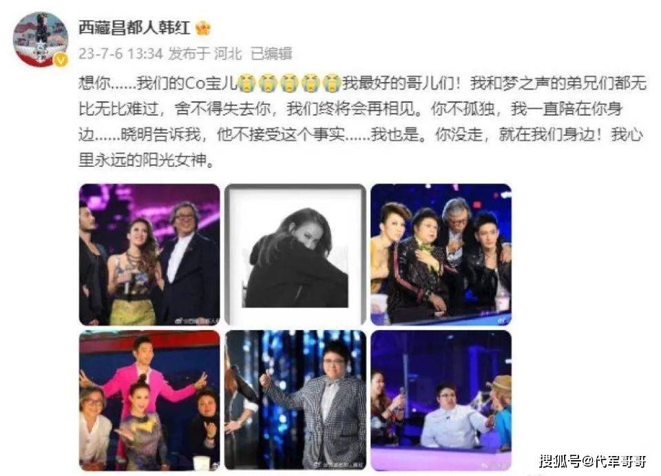 当得知李玟去世的消息后,韩红第一时间透过社交平台发文悼念,配文:想你,我们的Co宝儿,我最好的哥儿们!我哥梦之声的弟兄们都无比无比难过,舍不得失去你,我们终将会再相见,你不孤单,我一直陪在你身边……