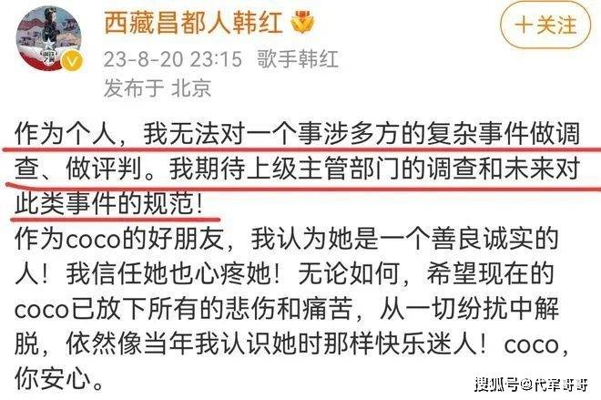 作为个人,韩红表示她无权对此事去做任何的调查和评判,但她期待上级主管部门对此事的调查,也希望他们未来对此类事件进行规范,作为coco好友,她心疼她的遭遇,也认为她是一个善良诚实的人,希望她能走得安心。