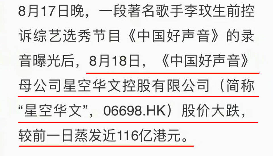 或许在他们看来,用冷处理的方式等风波过去,就万事大吉。却没想到,不仅事态没有平息,受事件影响《中国好声音》母公司星空华文的股价暴跌。