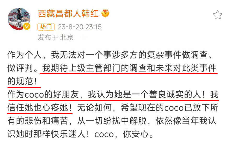 韩红在社交平台发文表示,作为个人,无法对一个事涉多方的复杂事件做调查、做评判,期待上级主管部门的调查和未来对此类事件的规范。