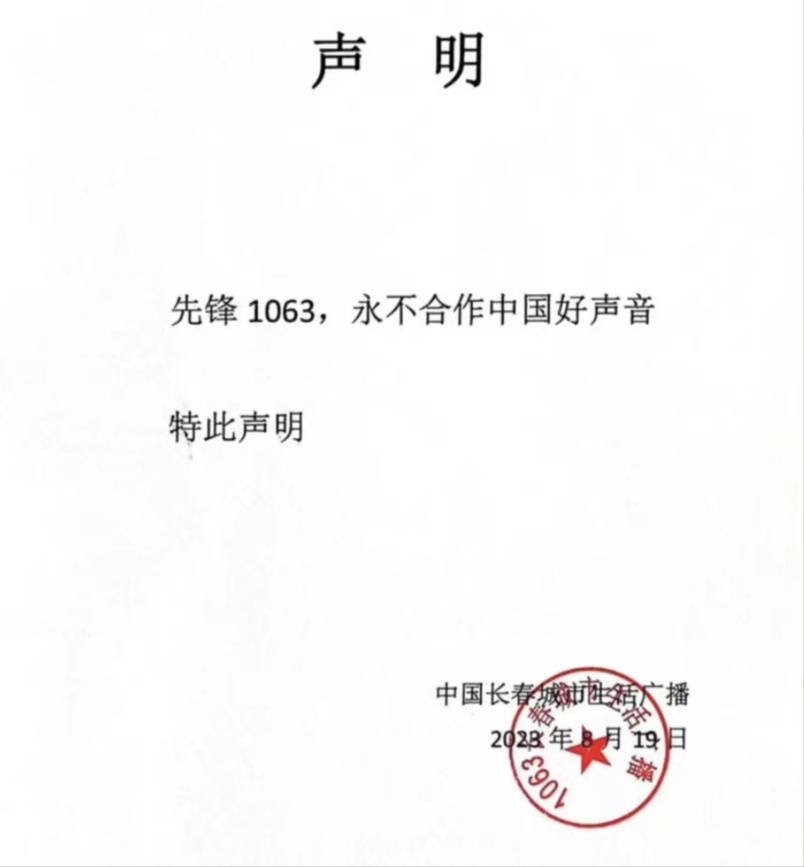 与此同时,与《中国好声音》合作的赞助商,也纷纷受到抵制,合作方长春城市生活广播频道发布声明,称1063永不合作《中国好声音》。