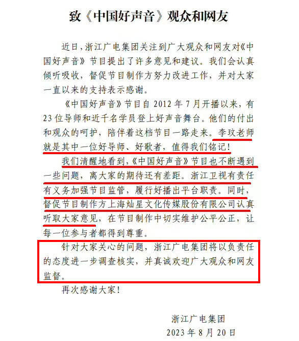 说实话,对于浙江广电集团如何恭维李玟、如何下定决心督促上海灿星文化传媒股份有限公司,大众并不关心,唯一在意的是浙江广电集团承诺的“进一步调查核实”。