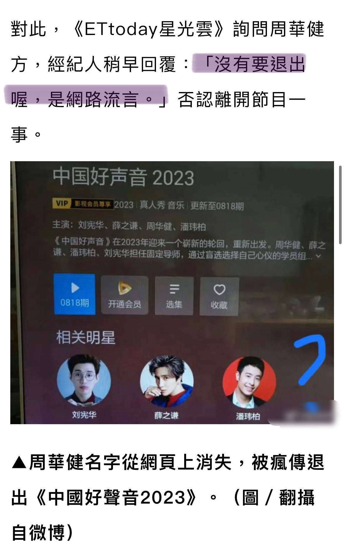 原标题:经纪人否认周华健退出《中国好声音》:是网络流言