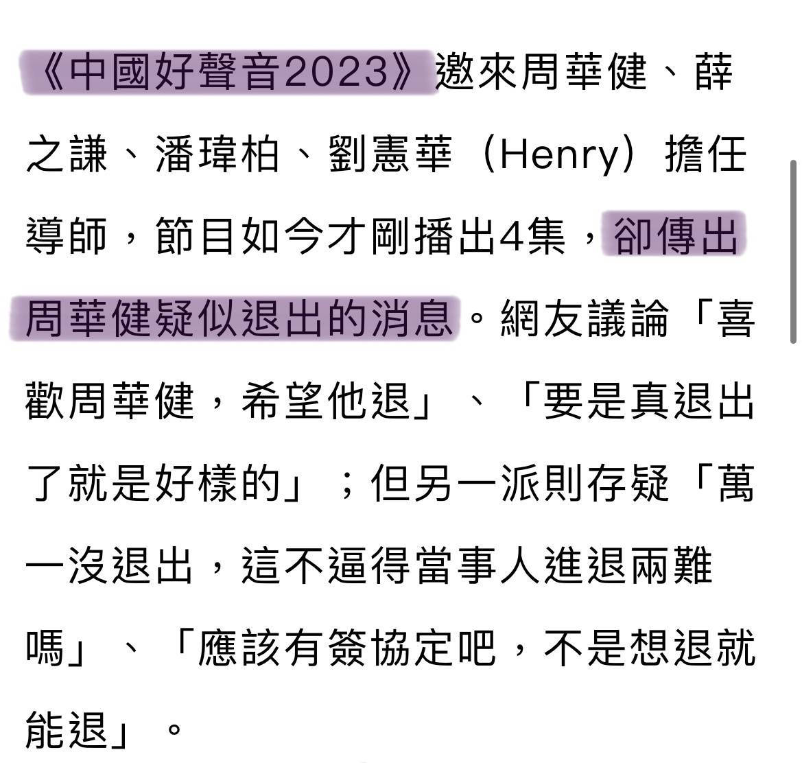 据悉,《好声音》事件持续发酵,此前传出周华健的名字从好声音网页消失,疑似退出今年的节目录制。