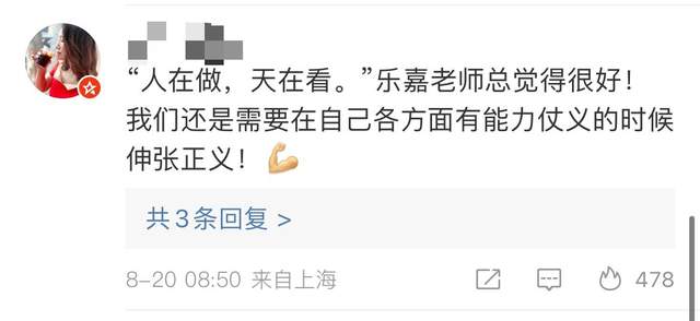 乐嘉的评论区当中也是得到了网友们的支持,有网友表示“人在做,天在看,乐嘉老师总结的很好!我们还是需要在自己各方面有能力仗义的时候伸张正义。”