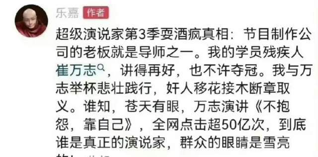 因为当时乐嘉的选手崔万志讲的再好,也不许夺冠,因此他只能和崔万志举杯悲怆践行,但是乐嘉表示苍天有眼,崔万志的演讲还是获得了50亿次的点击率,他表示群众的眼睛是雪亮的。