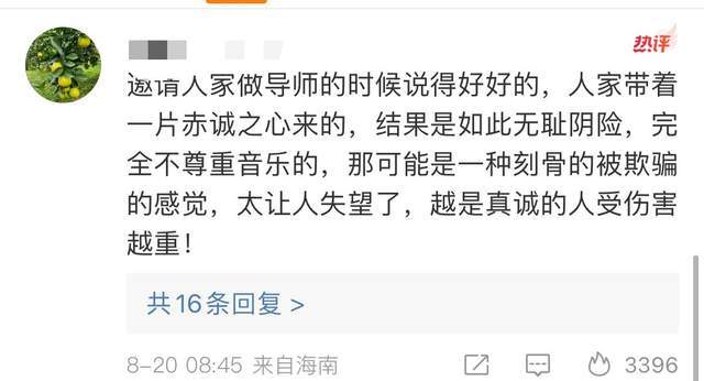 还有网友表示“邀请人家做导师的时候说的好好的,人家带着一片赤诚之心来的,结果却是无耻的阴险,完全不尊重音乐的,那可能是一种刻骨的被欺骗的感觉,太让人失望了,越是真诚的人受到的伤害越重。”