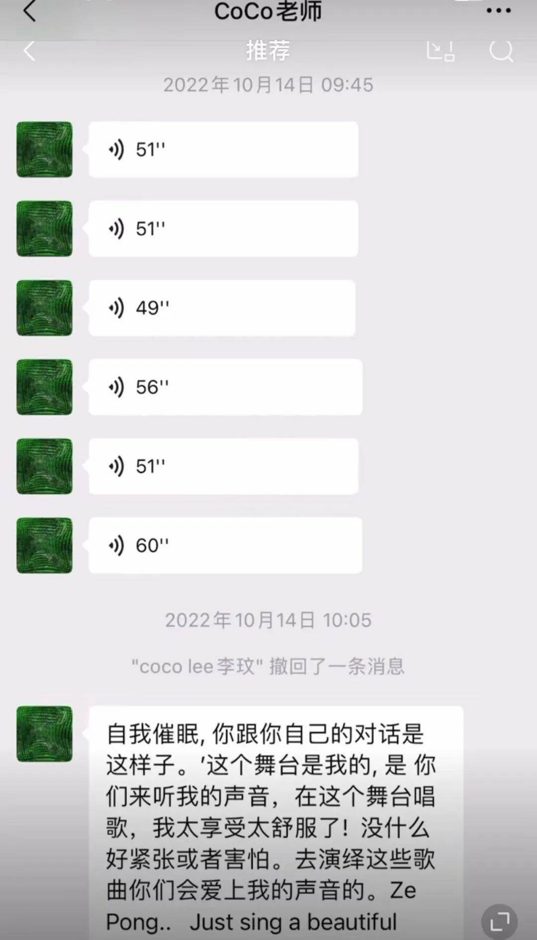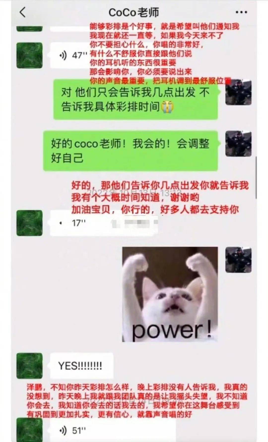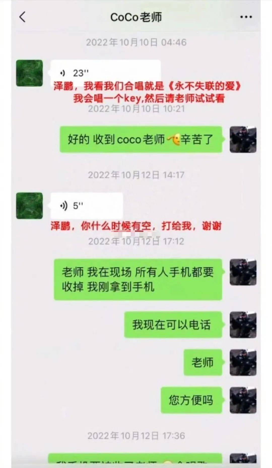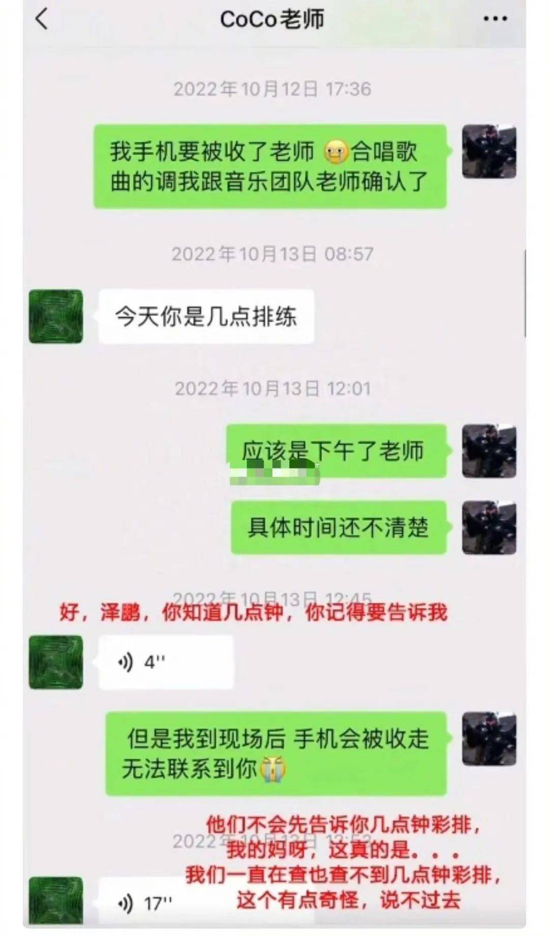 14号上午9点多,李玟又给王泽鹏发送了好几条长语音,先是遗憾地表示,没人通知自己不知道王泽鹏去彩排了,对她来说王泽鹏是自己的学员是自己的孩子,决赛前他们应该多见面。她不理解节目组为什么把他们隔得这么远,连说了好几遍“好奇怪”。