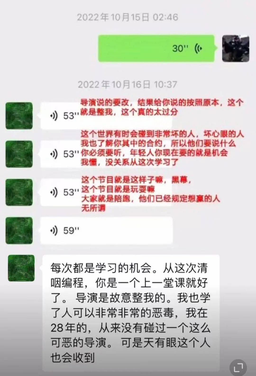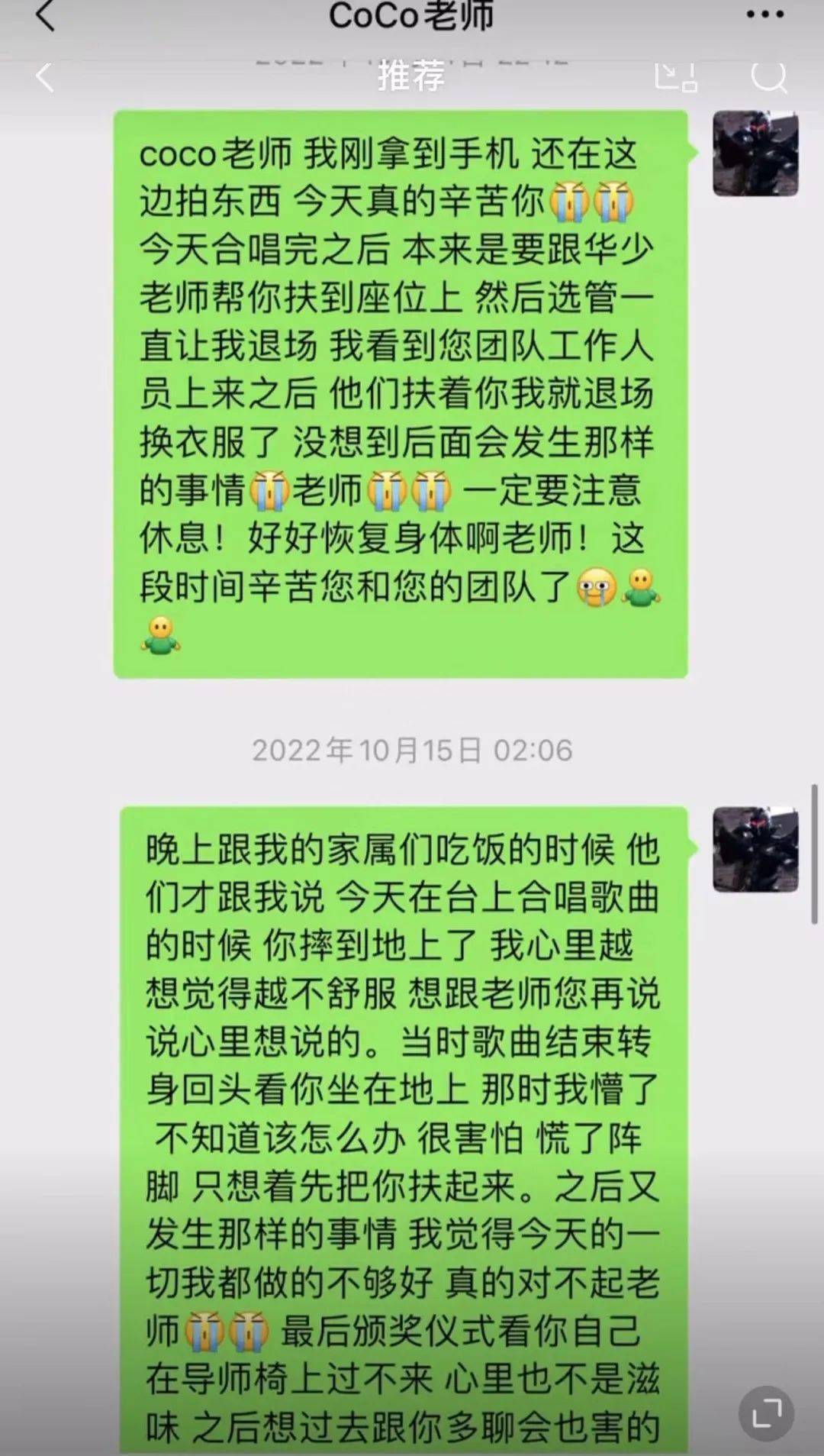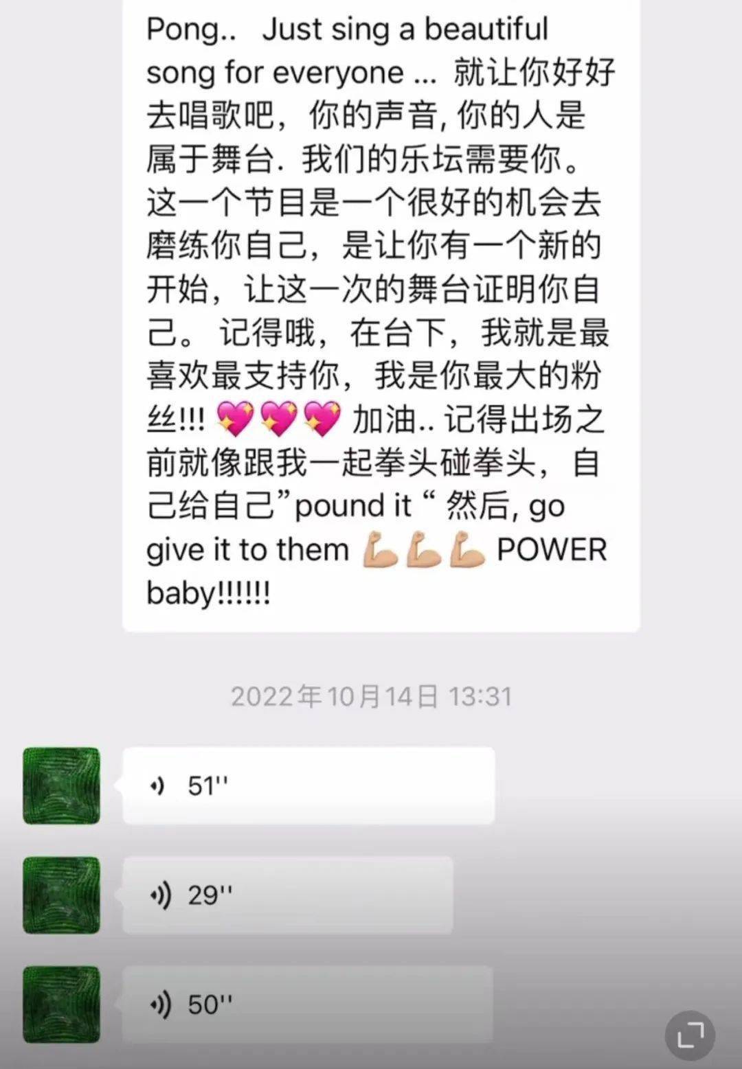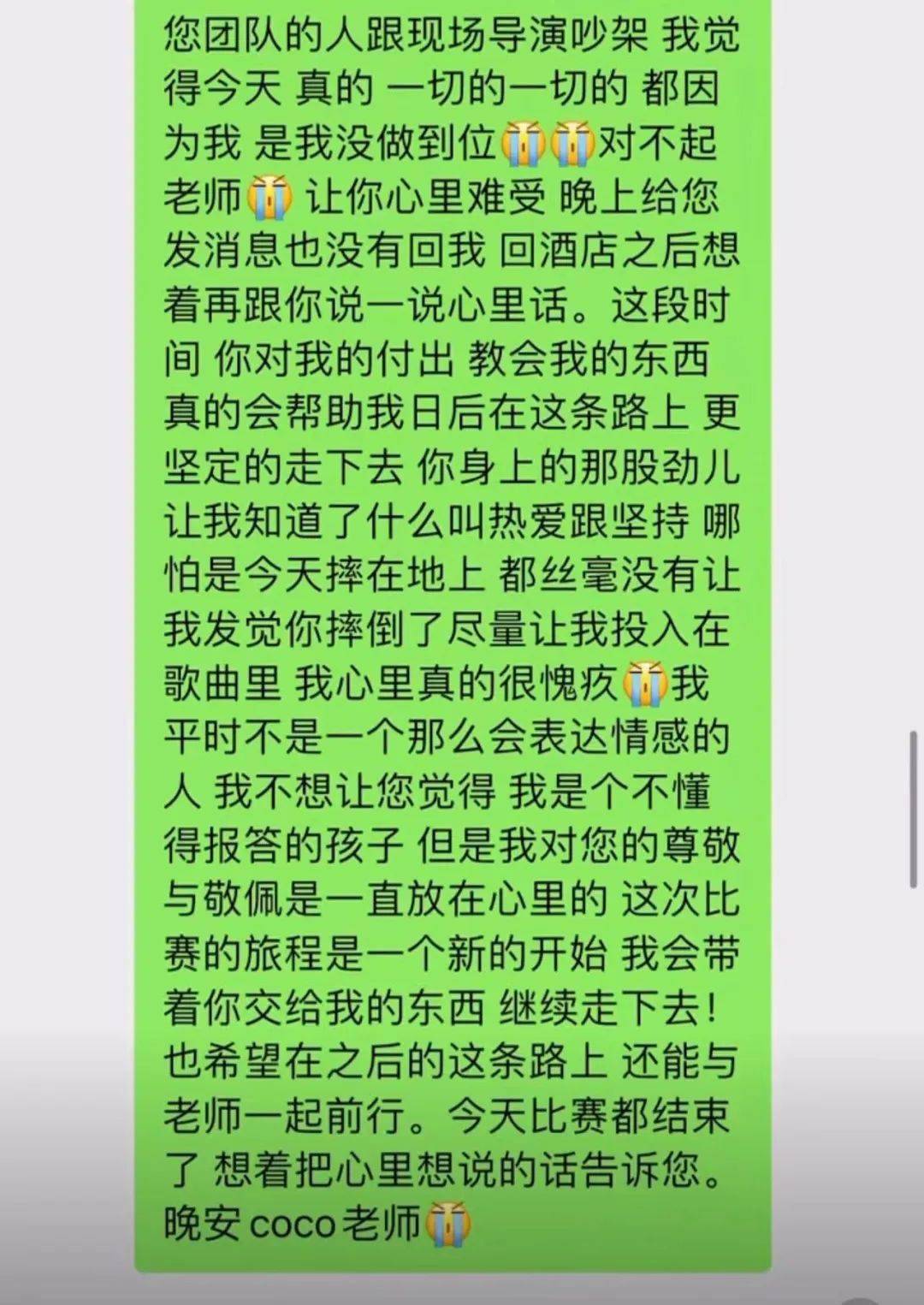 14号上午9点多,李玟又给王泽鹏发送了好几条长语音,先是遗憾地表示,没人通知自己不知道王泽鹏去彩排了,对她来说王泽鹏是自己的学员是自己的孩子,决赛前他们应该多见面。她不理解节目组为什么把他们隔得这么远,连说了好几遍“好奇怪”。