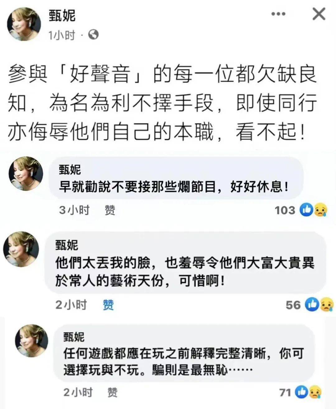 然而,除了媒体和品牌的声援外,还有一众明星大咖纷纷发声,支持李玟的立场。其中,李玟的好友甄妮发文指责参与《好声音》的每一位都欠缺良知,侮辱了本职,赢得了李玟的感激之情。