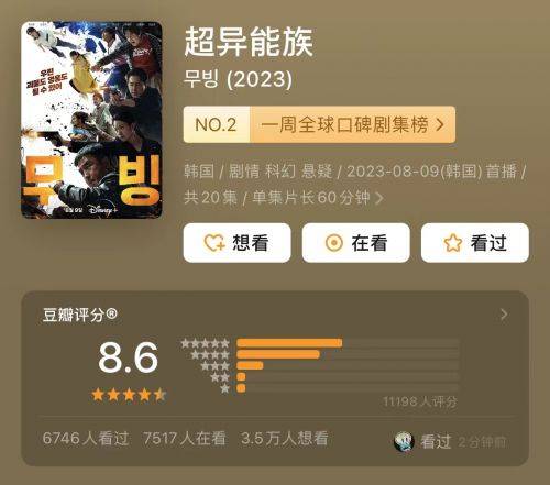 8月9日,韩剧《超能异族》于Disney 上首播,在豆瓣获得8.6分的评分。