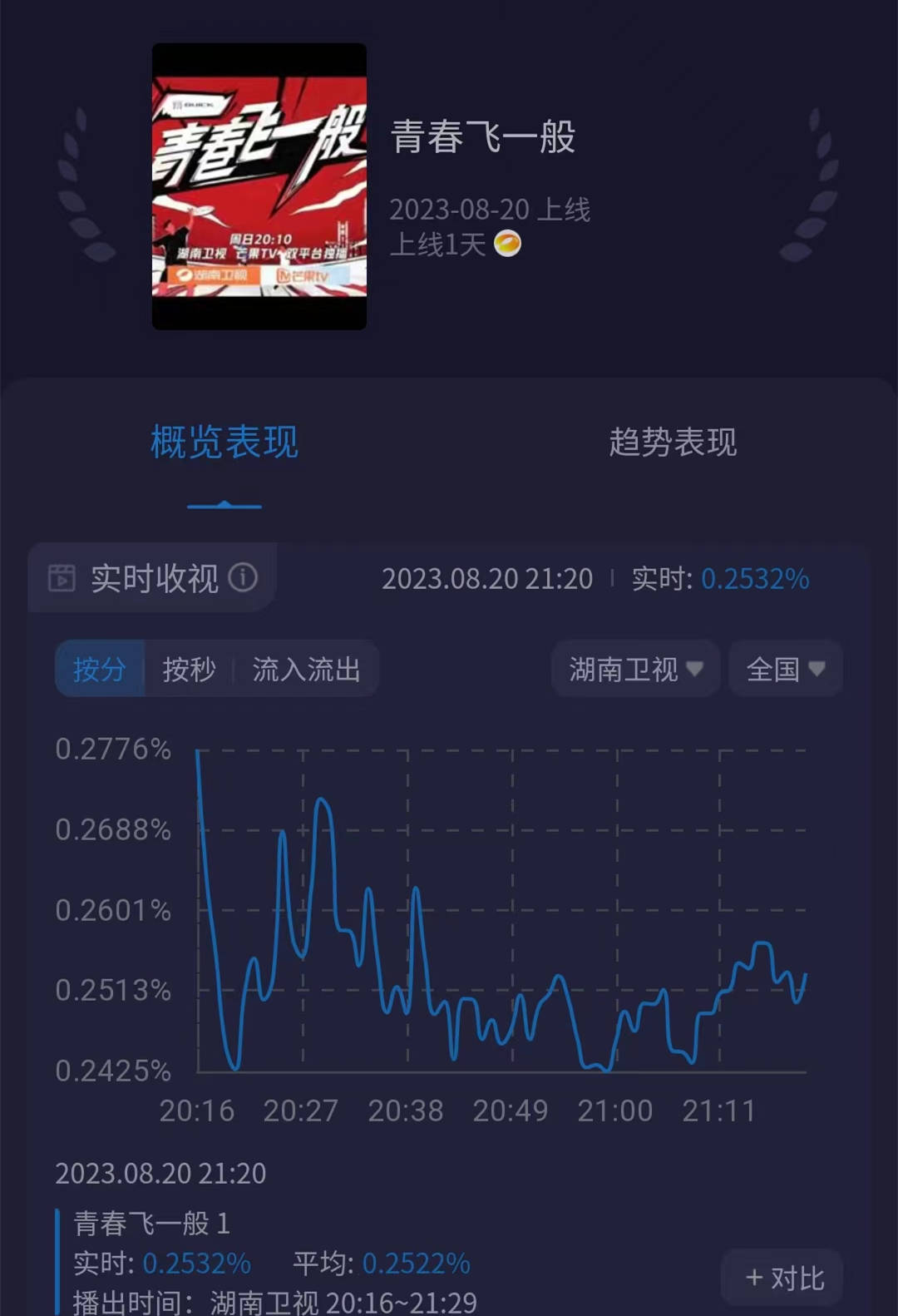 基于酷云实时的收视率数据来看,《青春飞一般》的收视率成绩并不太好。晚间九点,节目已经播出过半的时候,它的实时收视率也只有0.24%前后。在各大卫视正在播出的节目当中,《青春飞一般》排在第4的位置上。这个实时排名,和湖南卫视的卫视一哥的身份似乎不太匹配。