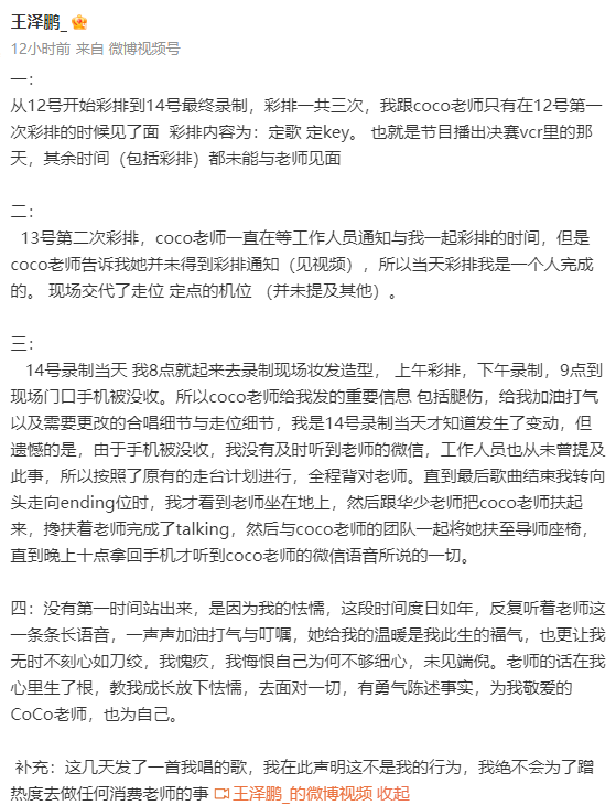 对此,被临时cue的学员王泽鹏发声回应,透露节目组事先并未通知李玟彩排,他因为手机被没收无法看到李玟让他搀扶的信息,导致录制时未能陪在李玟身边,等歌曲结束后才发现李玟已经坐在地上。